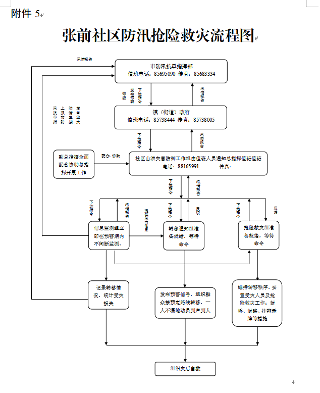 为了建立社区防汛快速反应机制,组织和领导山洪灾害防御工作,成立社区防汛指挥机构,领导和组织山洪灾害防御工作,其机构一般设在社区居委会,主要由镇挂点领导、驻社区干部。总指挥一般由社区主任担任,副总指挥一般由社区副主任担任。机构下设信息监测组、转移通知组和应急抢险组,工作组组长及组员可由社区居委会挑选担任(详见附件1)。