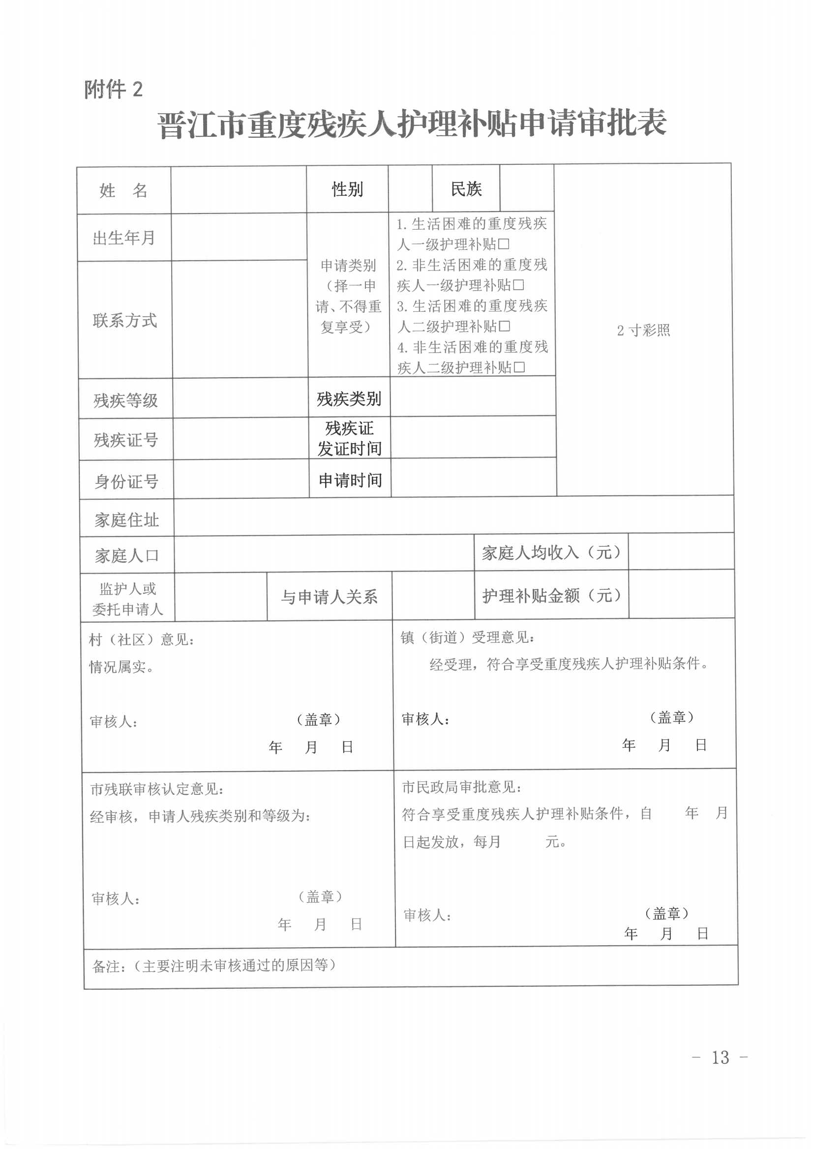 附件:1.晋江市困难残疾人生活补贴申请审批表