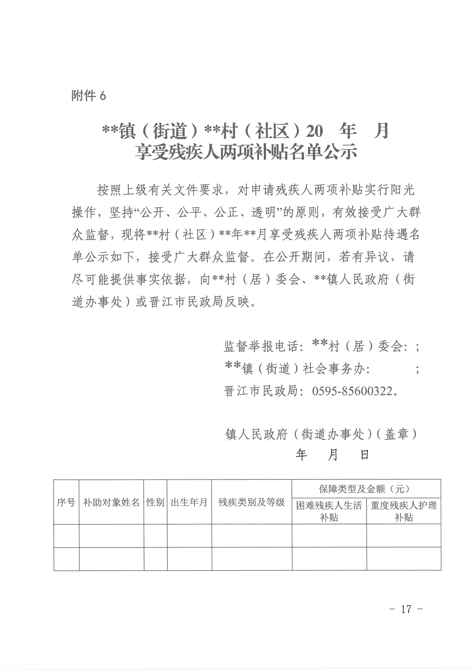 在确定本月残疾人两项补贴对象后,各镇(街道)应及时对本月本辖区两项补贴发放情况进行公示,公示内容包括:补贴对象姓名、补贴类型、补贴金额等基本信息(附件6)。