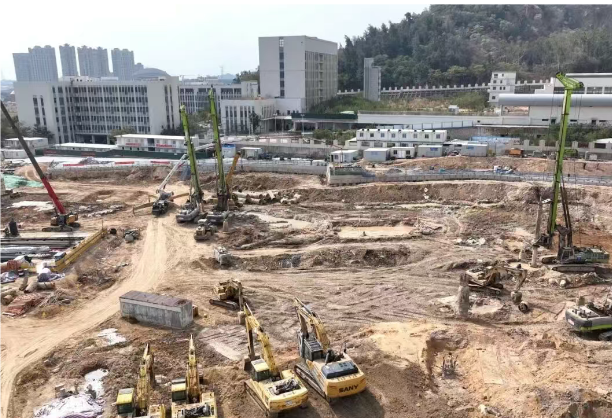 走进晋江未来产业加速器项目(一期)项目工地,多台打桩机、挖掘机等大型机械正在繁忙作业,现场一派片热火朝天。工人们分组作业,全力推进桩基工程和土方工程的施工。