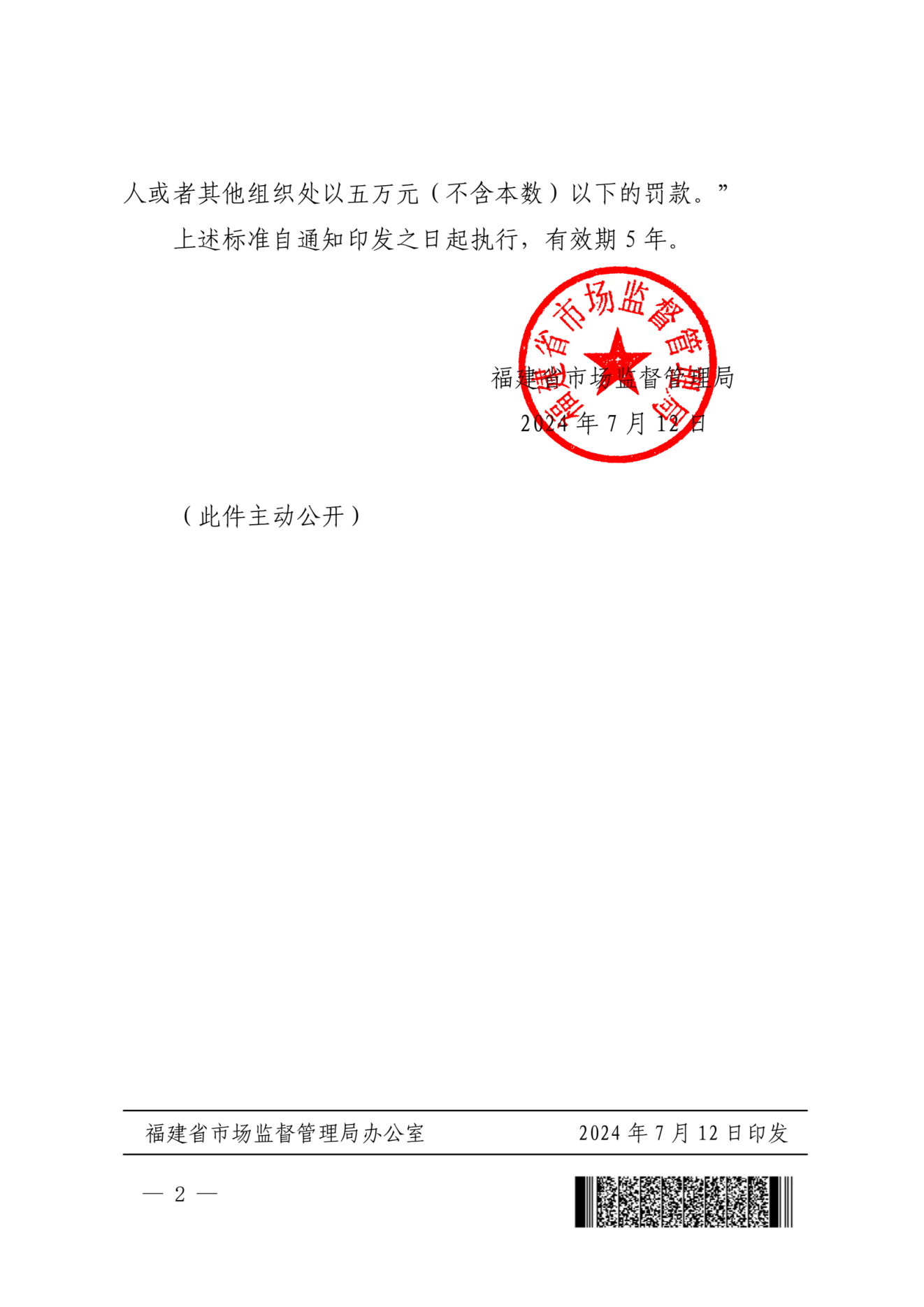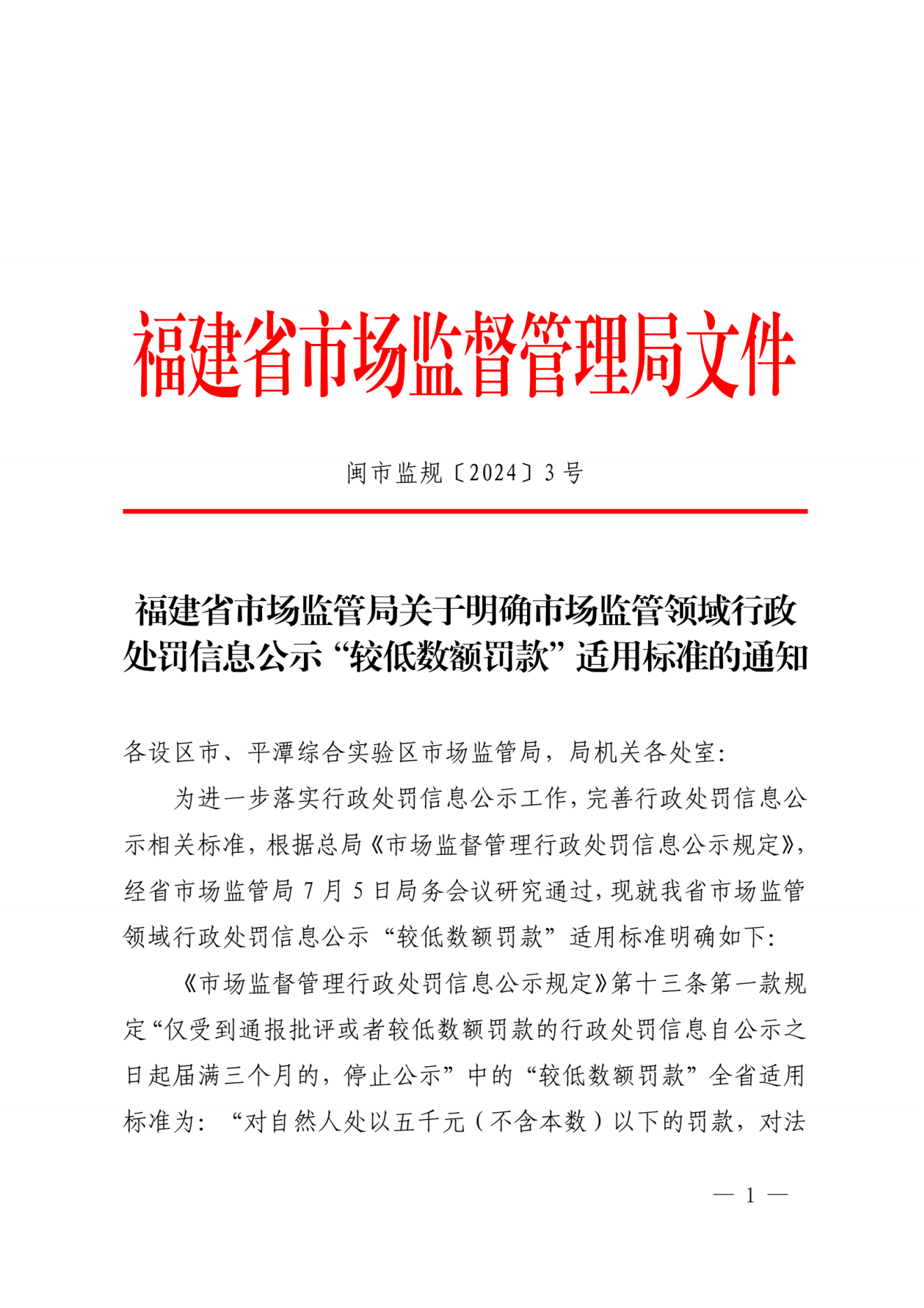福建省市场监管局关于明确市场监管领域行政处罚信息公示“较低数额罚款”适用标准的通知(闽市监规〔2024〕3号)